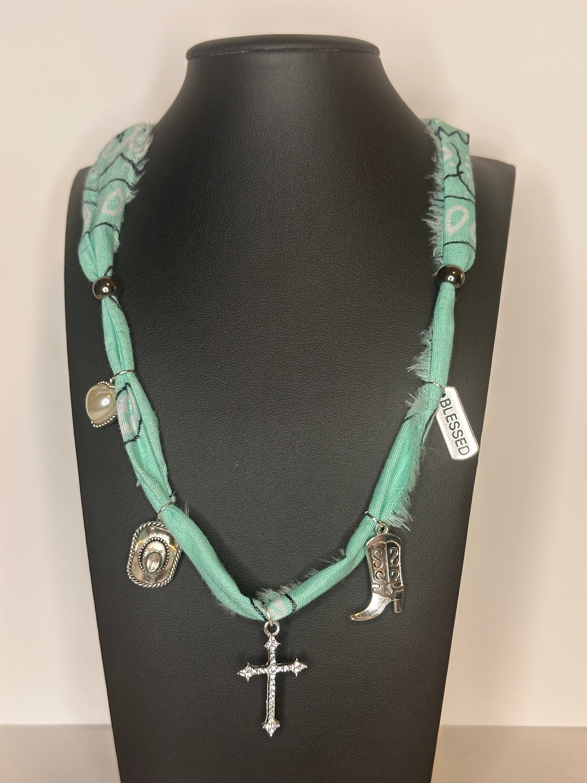 Aqua bandana necklace featuring pearl heart, cowboy hat, rhinestone cross, boot, and blessed charms in silver, with lobster clasp.
