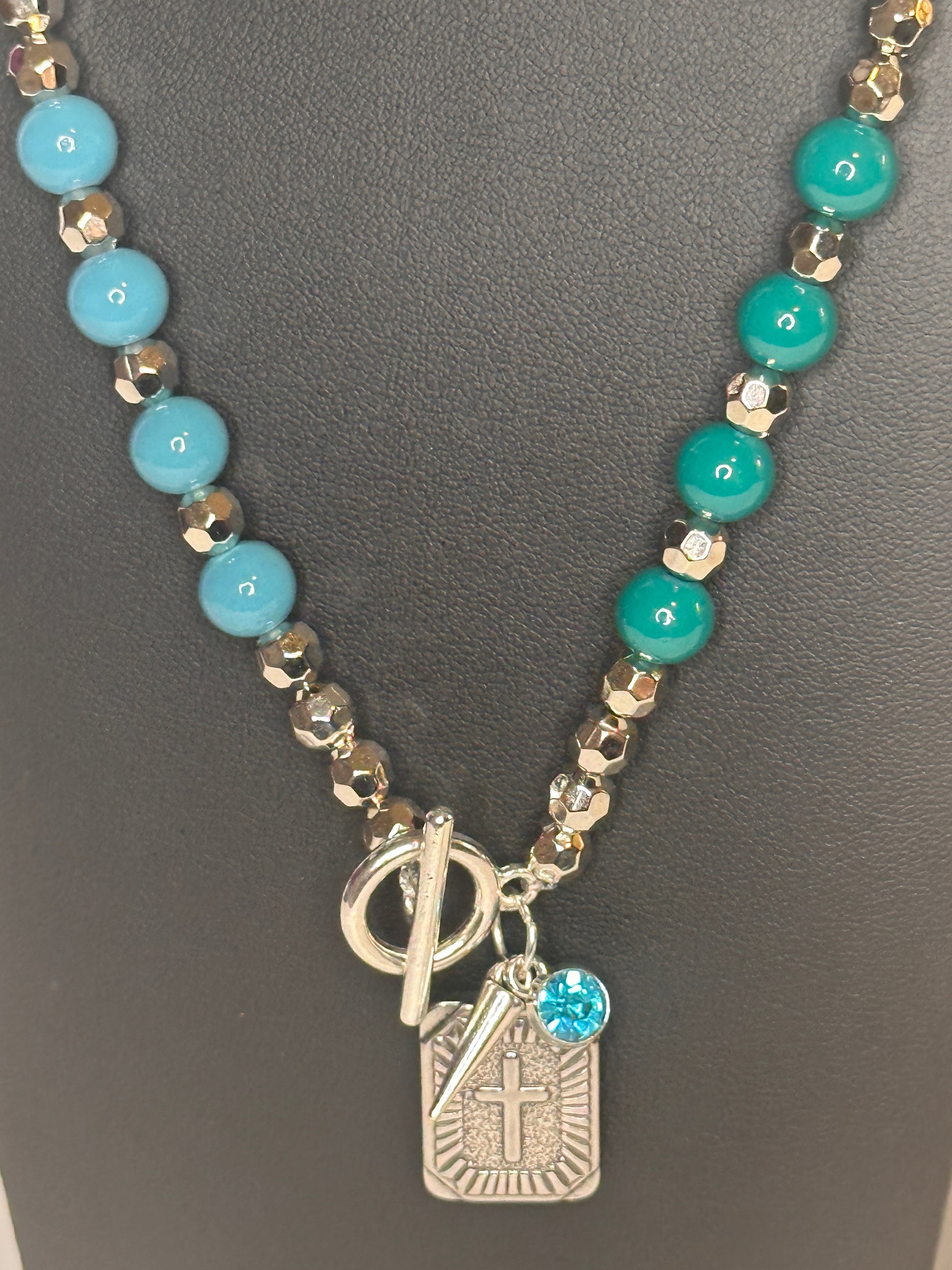 Multi hue blue and silver color beaded necklace, featuring cross, spike, and stone charms, with toggle clasp.