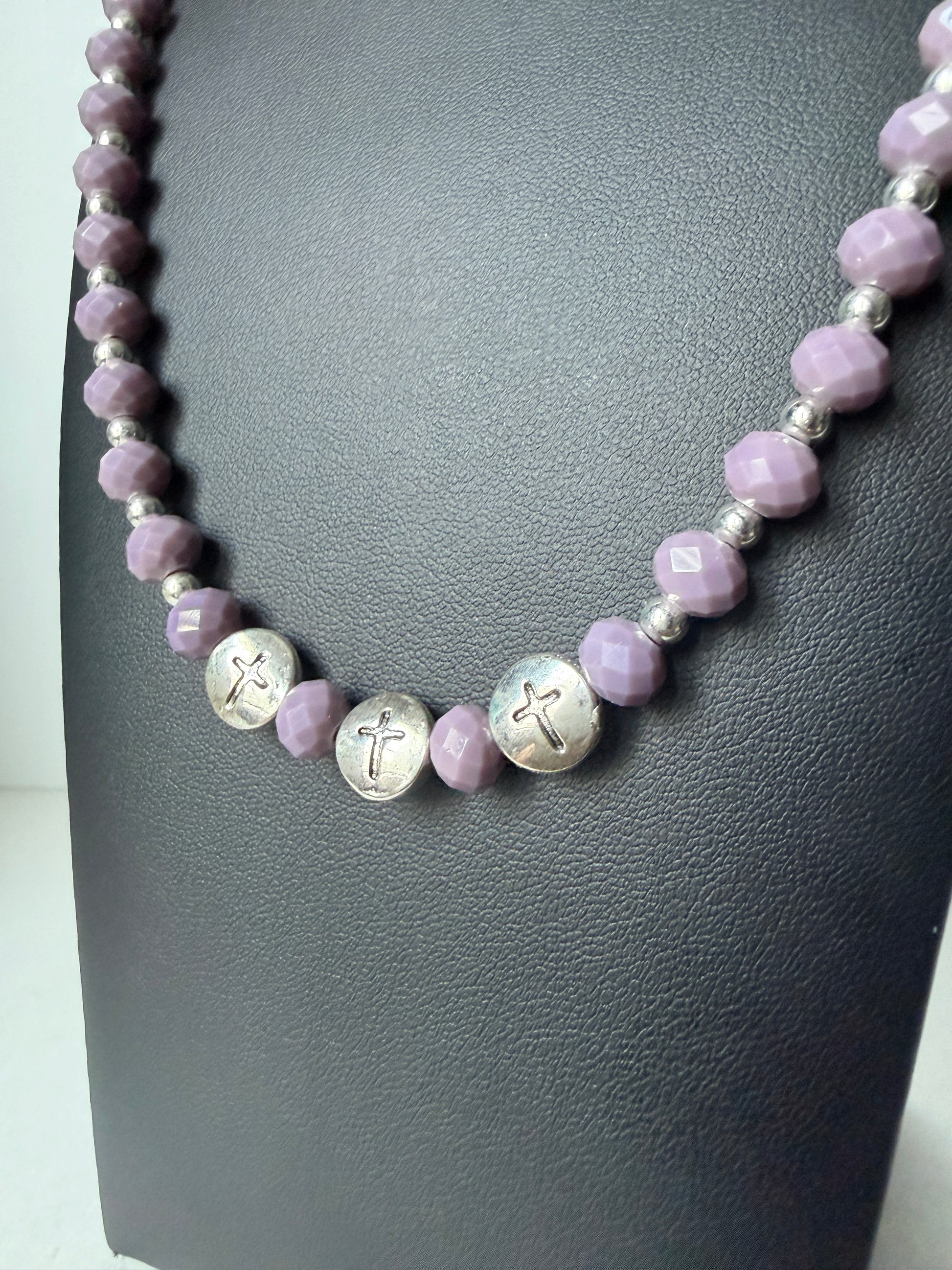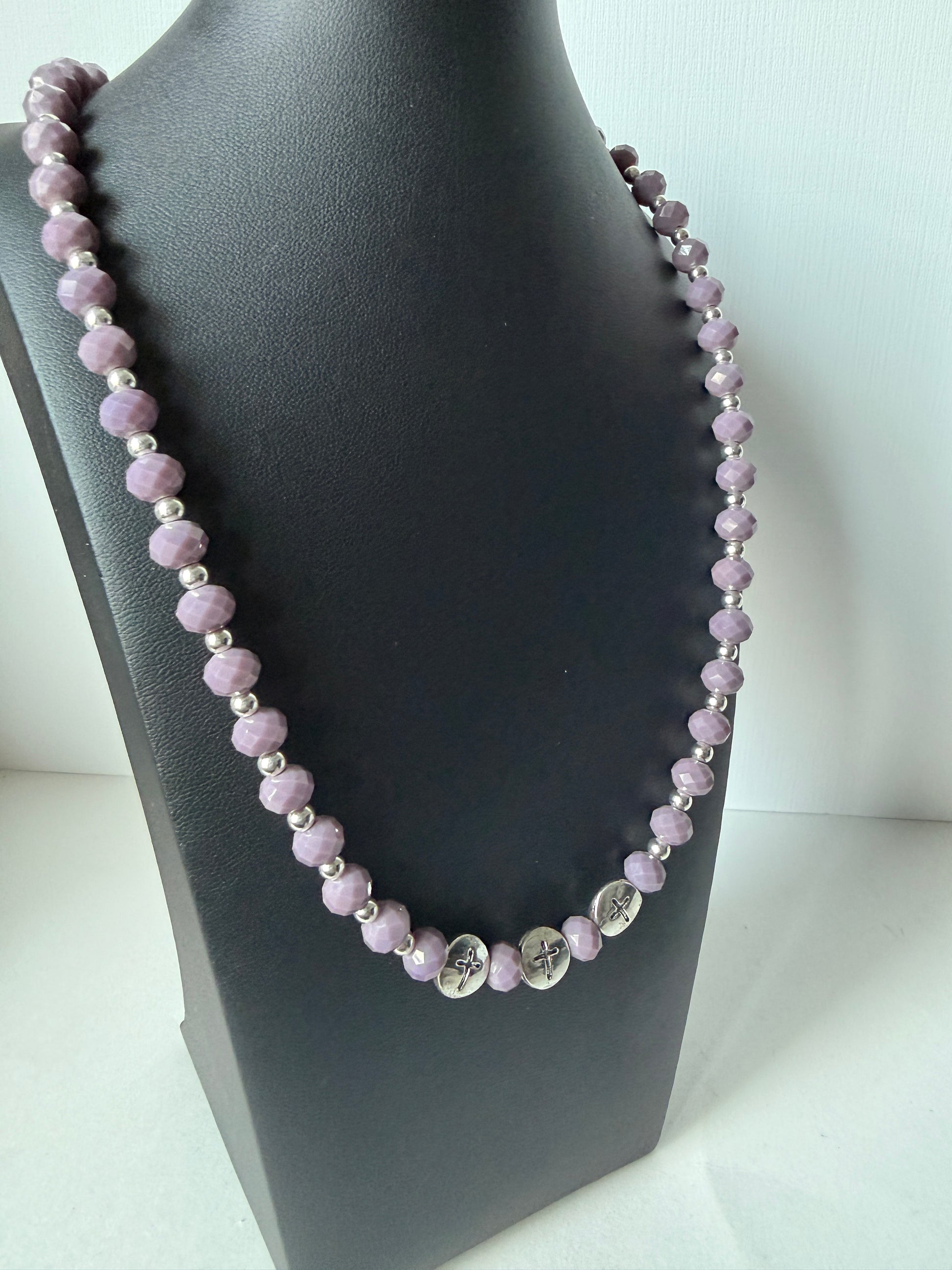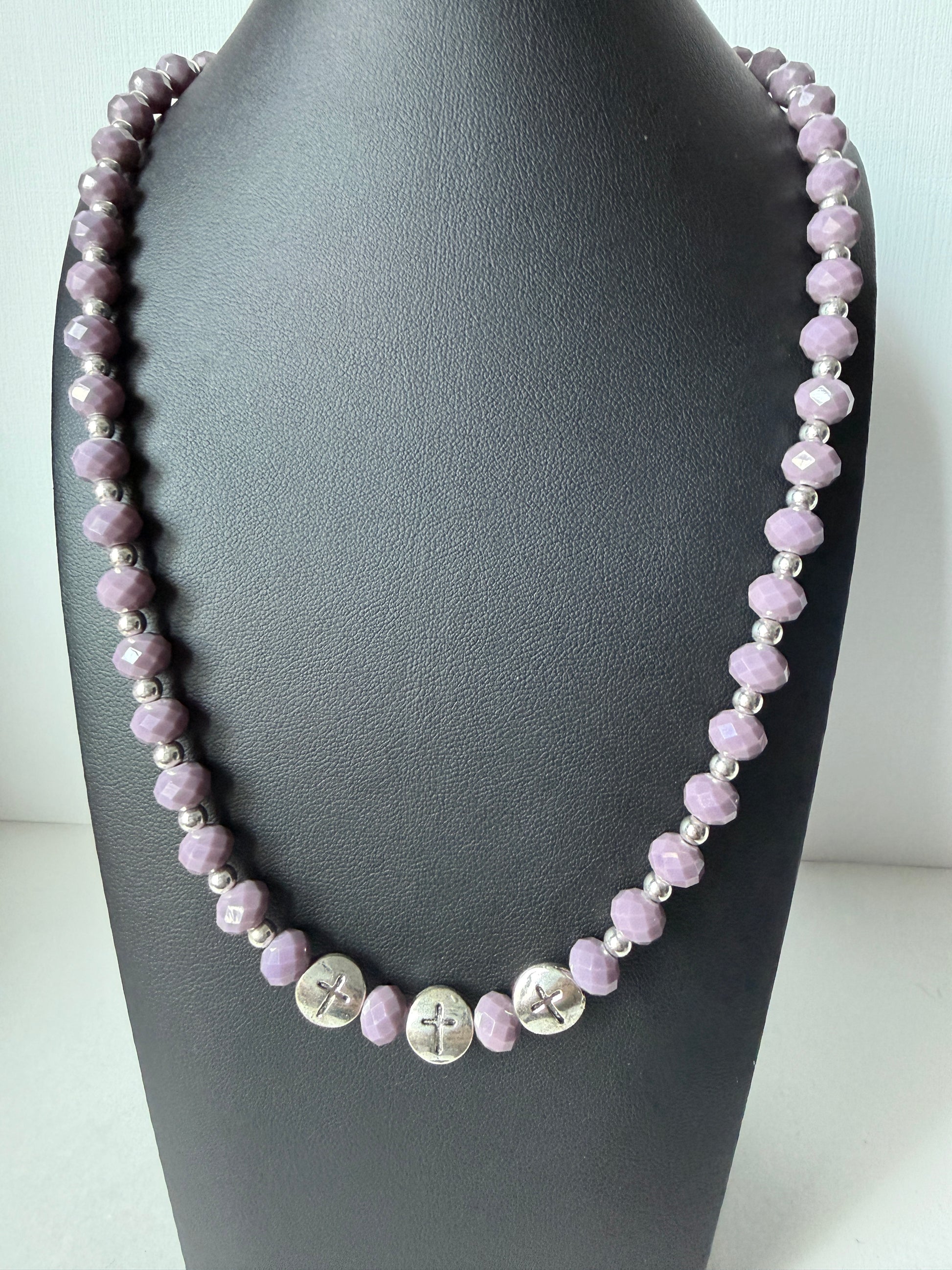 Lilac crystal glass beads with hints of silver, featuring 3 crosses.