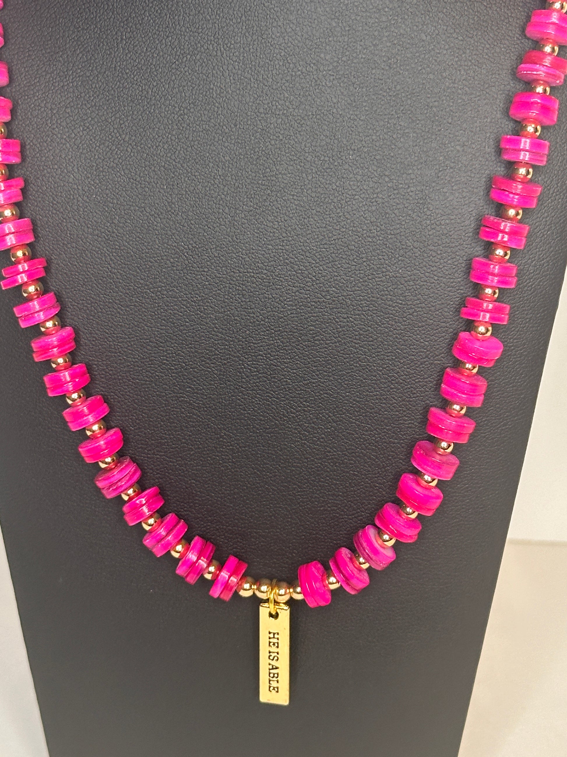 Hot pink and gold color beaded necklace featuring He Is Able pendant charm.