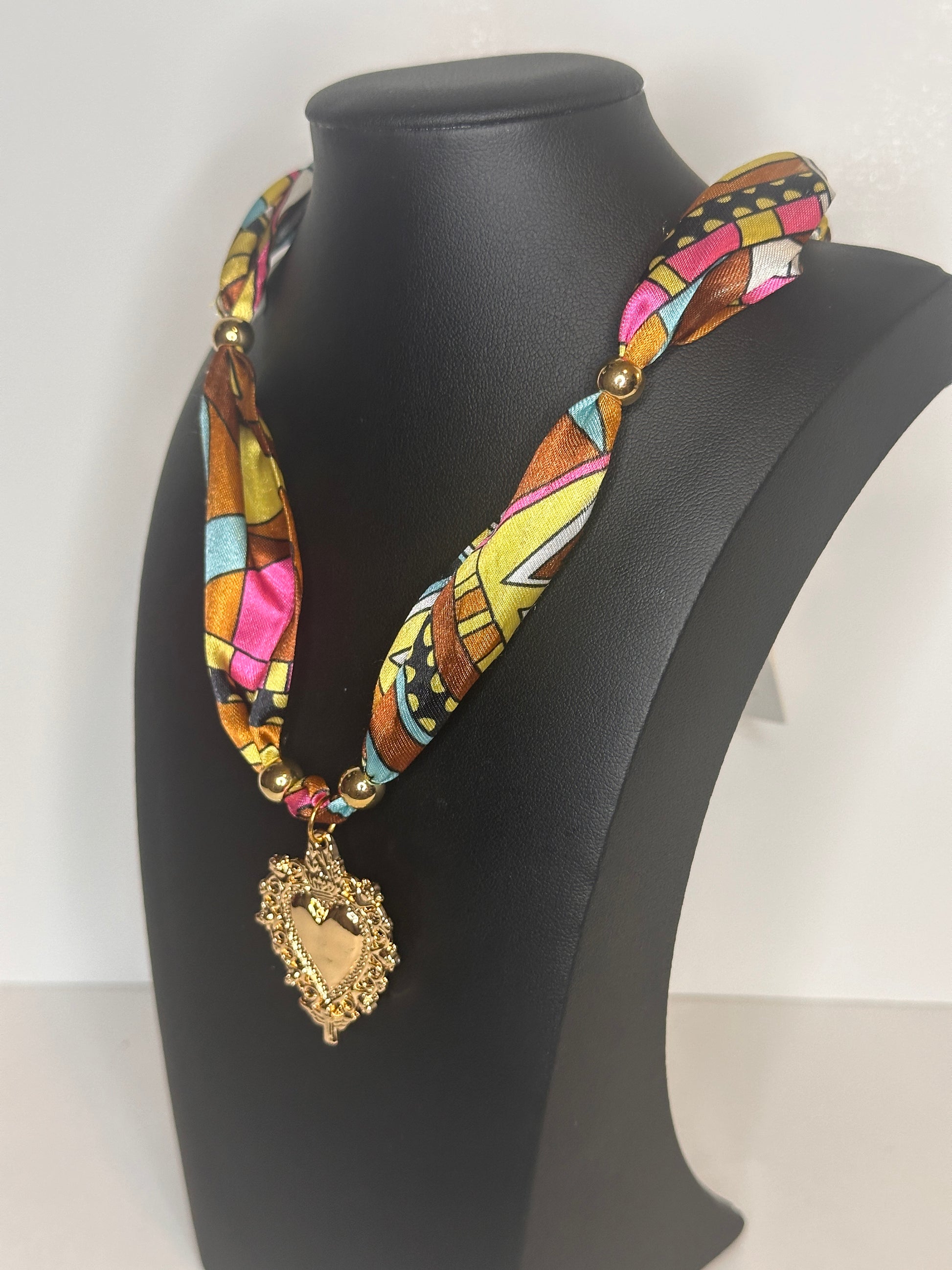 Silky scarf necklace featuring gold colored accent beads and oversized, shiny heart pendant. Lobster clasp closure with faux tied design.