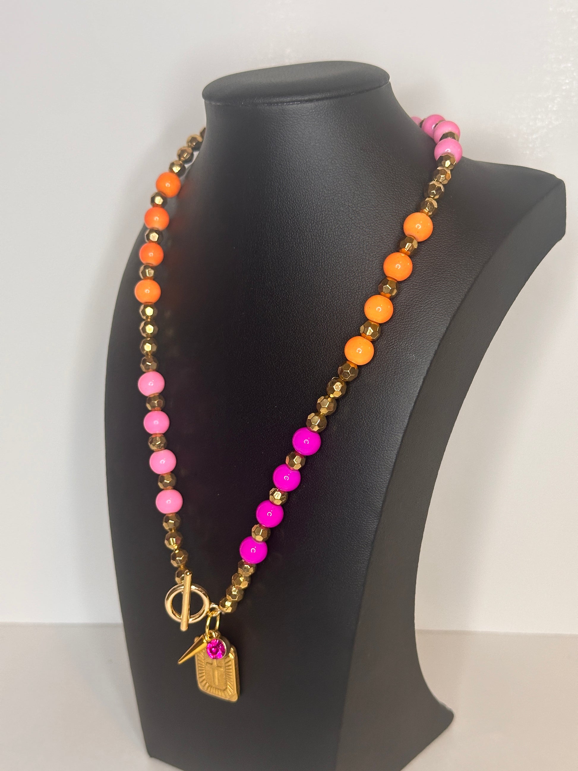 Multi hue pinks, orange and gold color beaded necklace, featuring cross, spike, and stone charms, with toggle clasp.