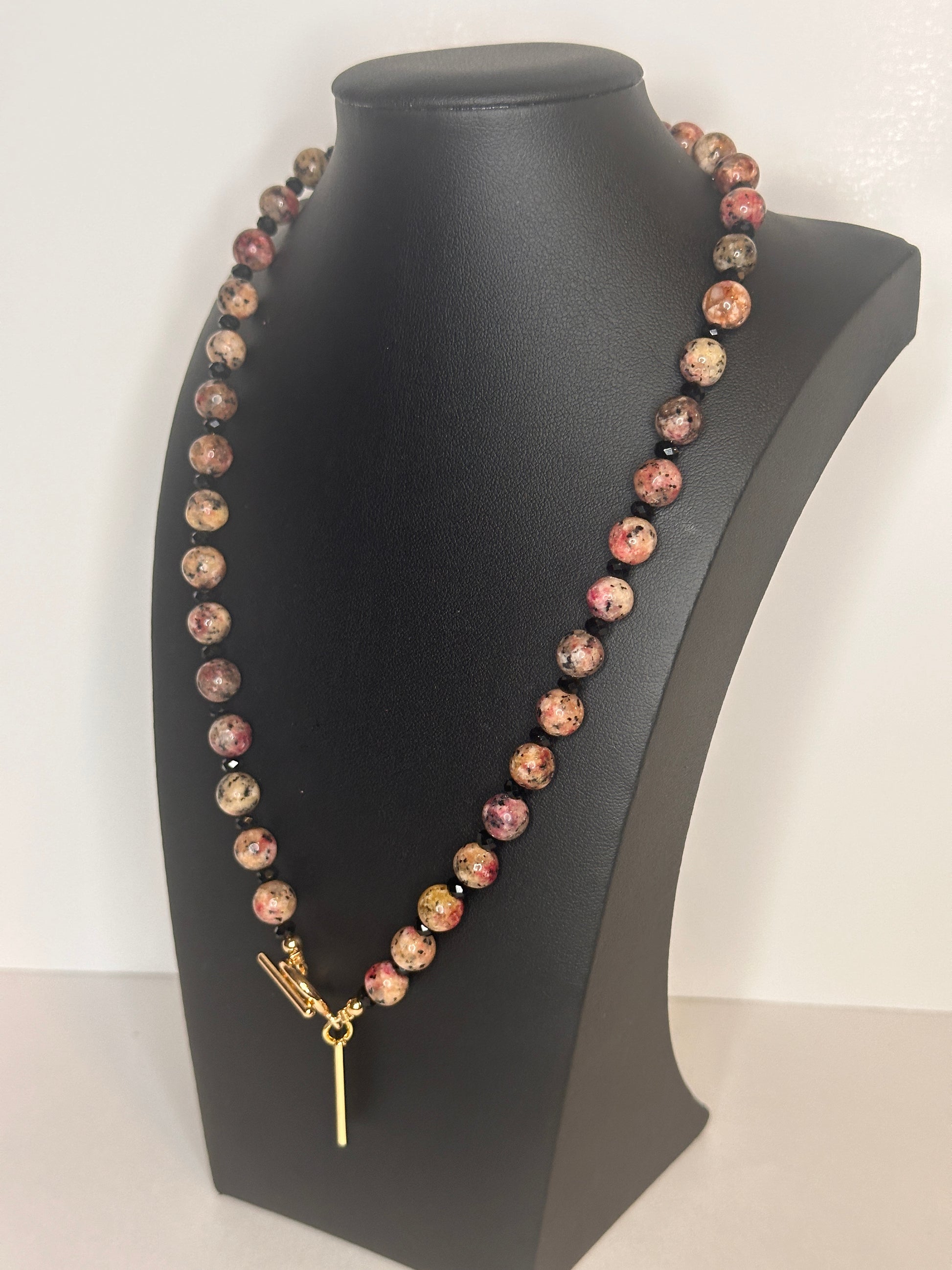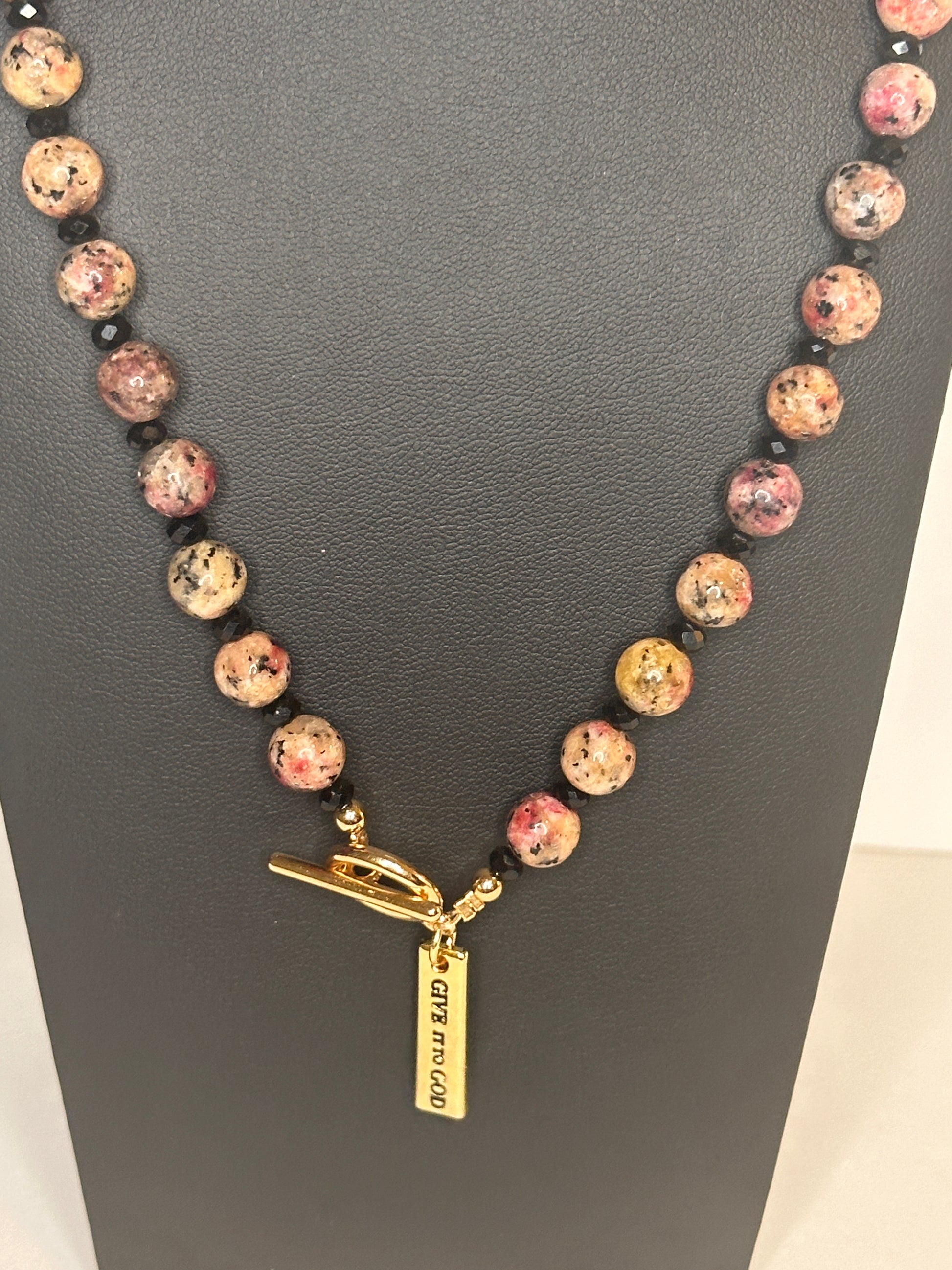 Pink rhodonite stone and black crystal beaded necklace, featuring gold color Give It To God pendant charm and toggle clasp.