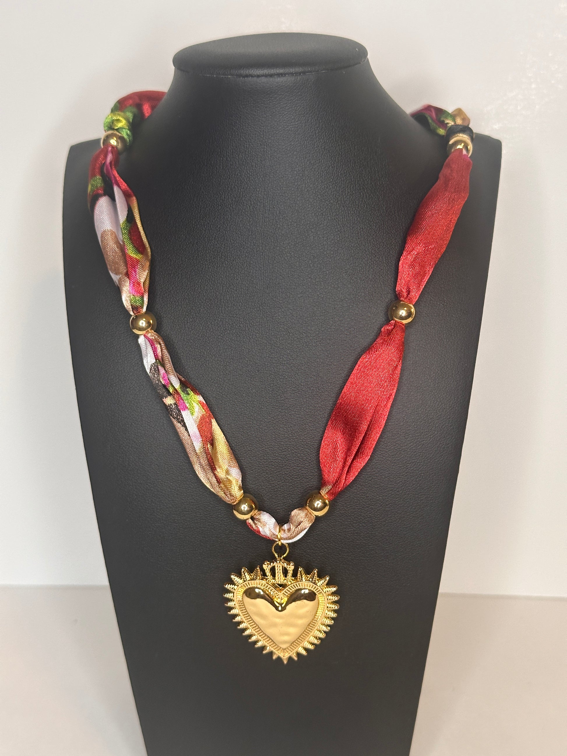 Silky scarf necklace featuring gold colored accent beads and oversized, shiny heart pendant. Lobster clasp closure with faux tied design.