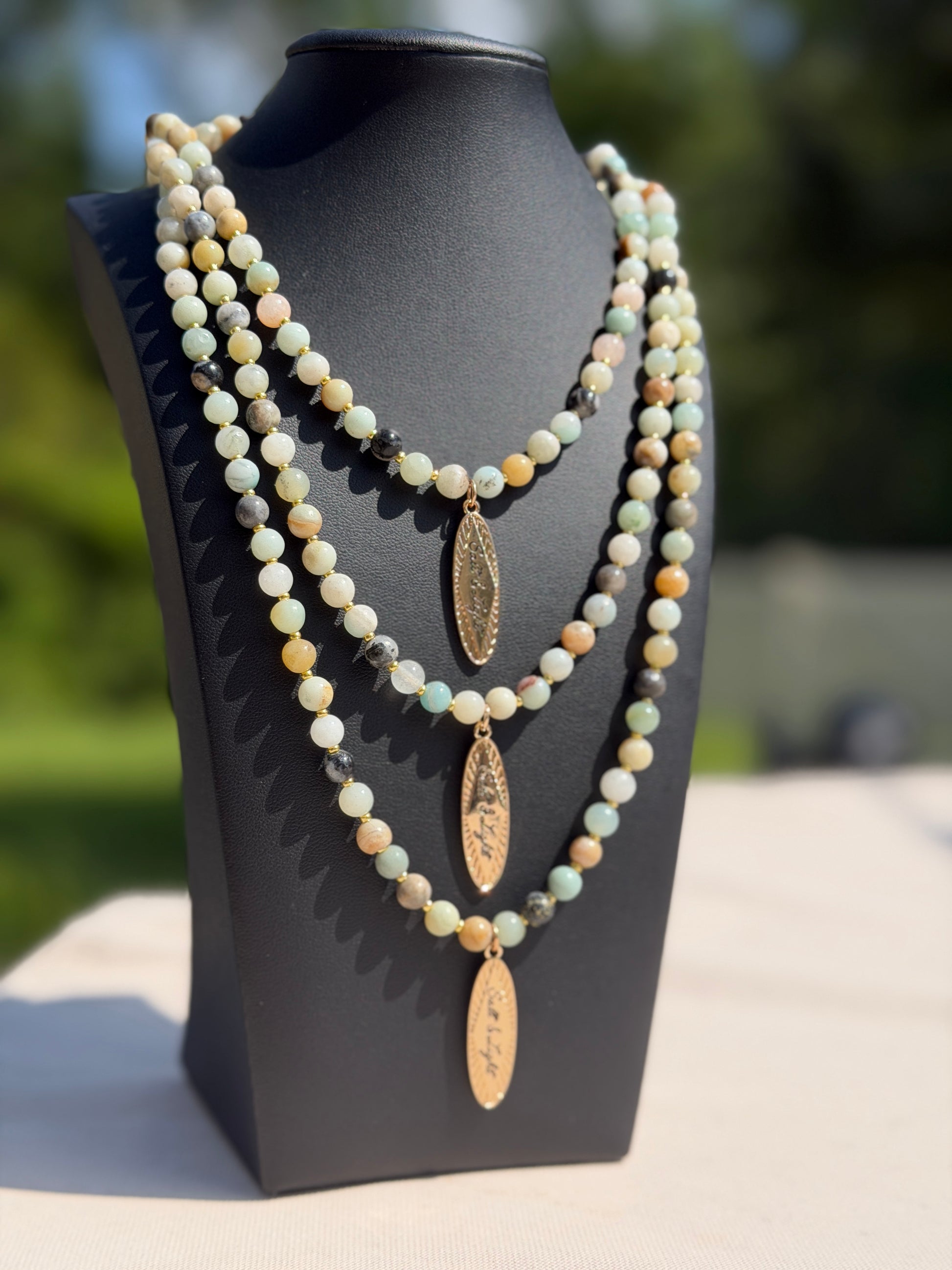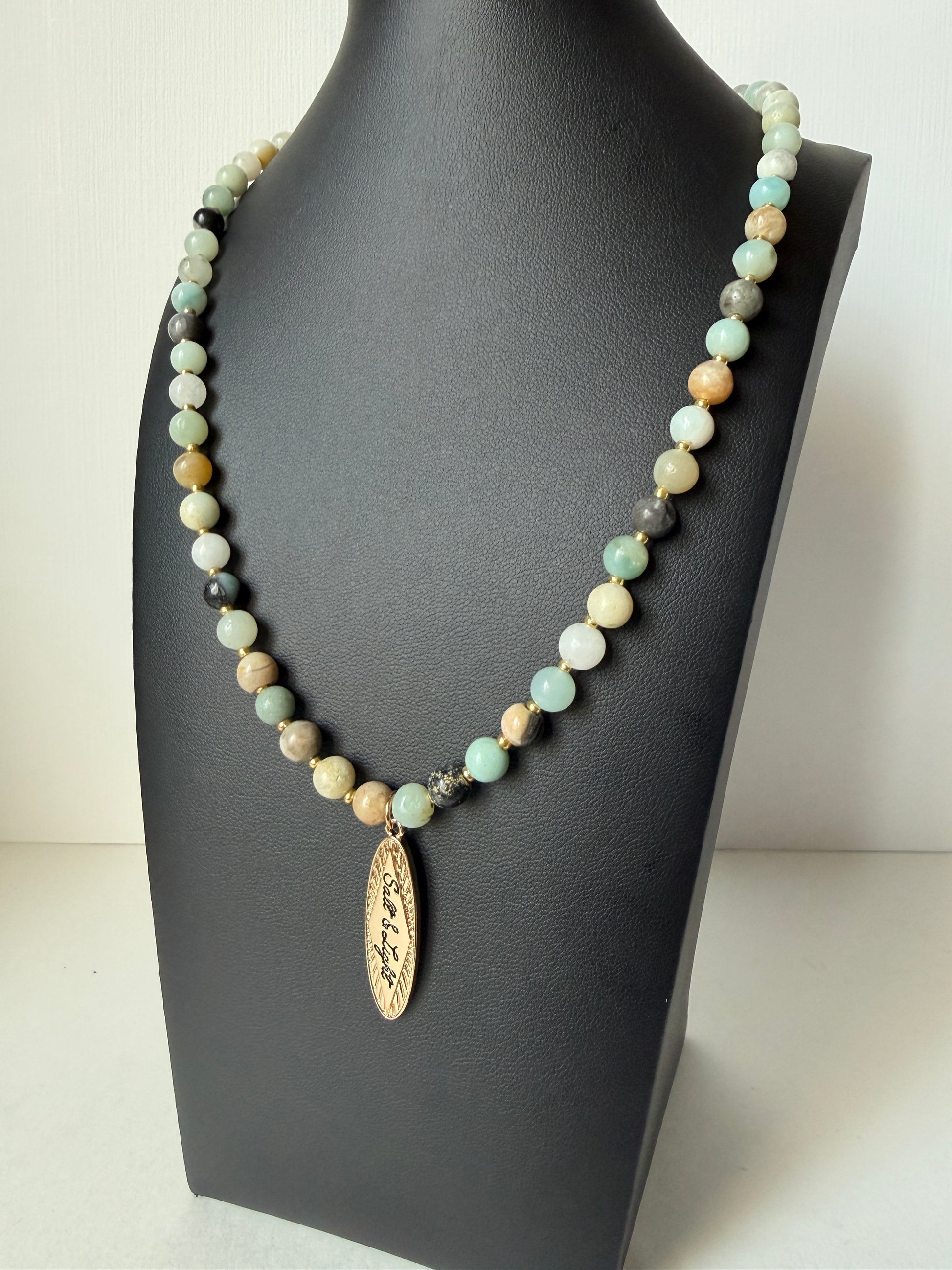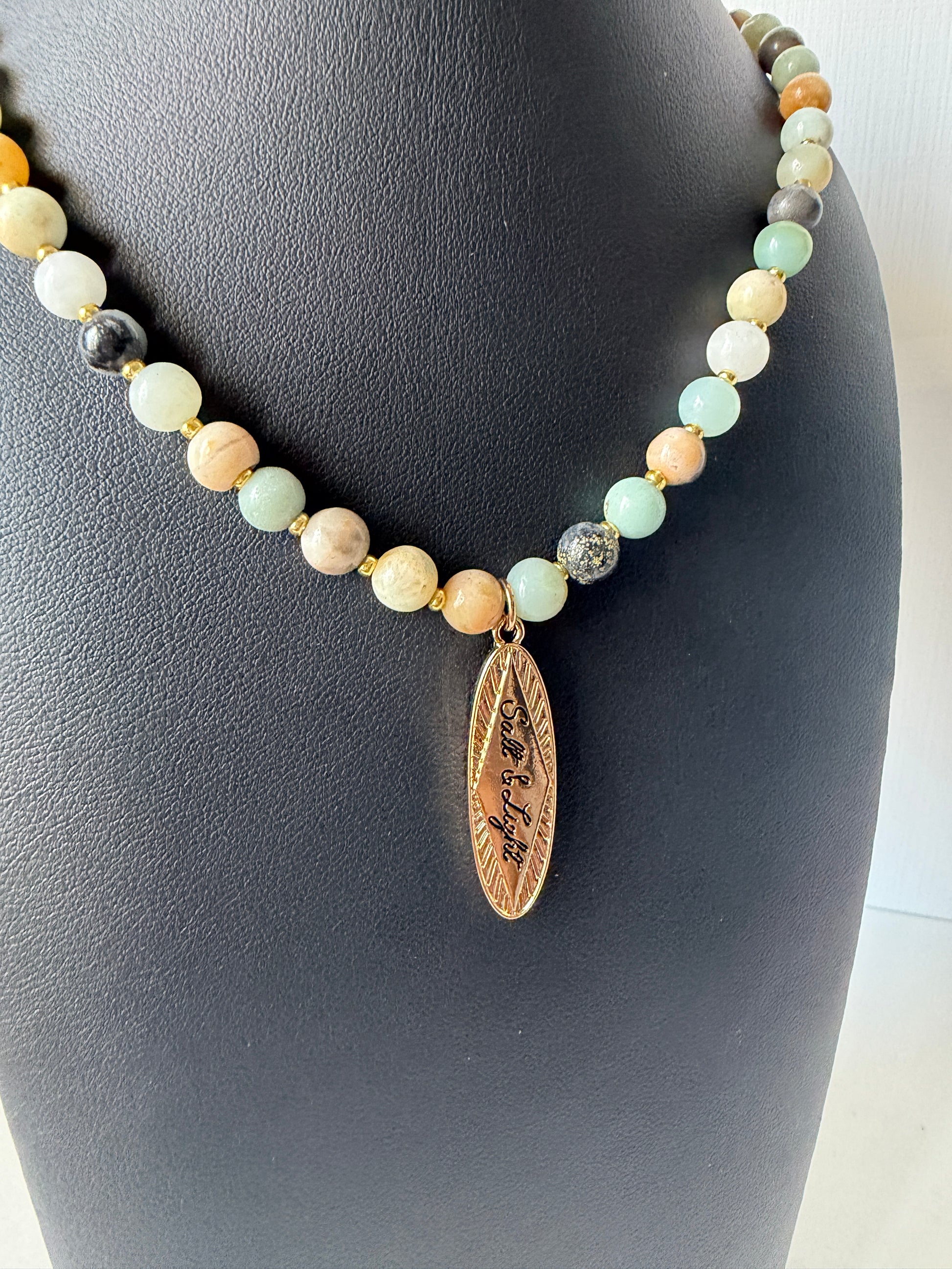 Natural jasper stone beaded necklace with gold color pendant.