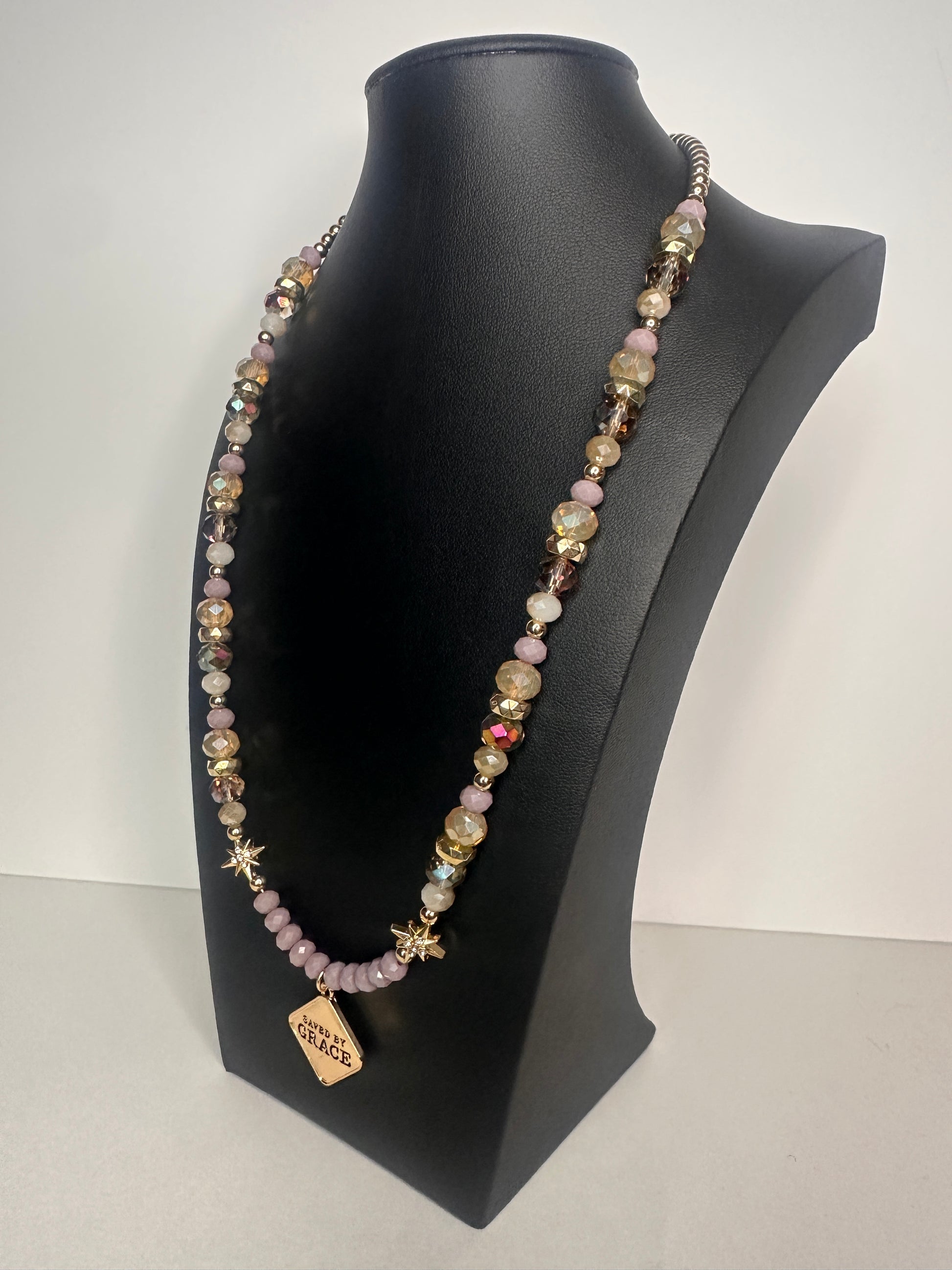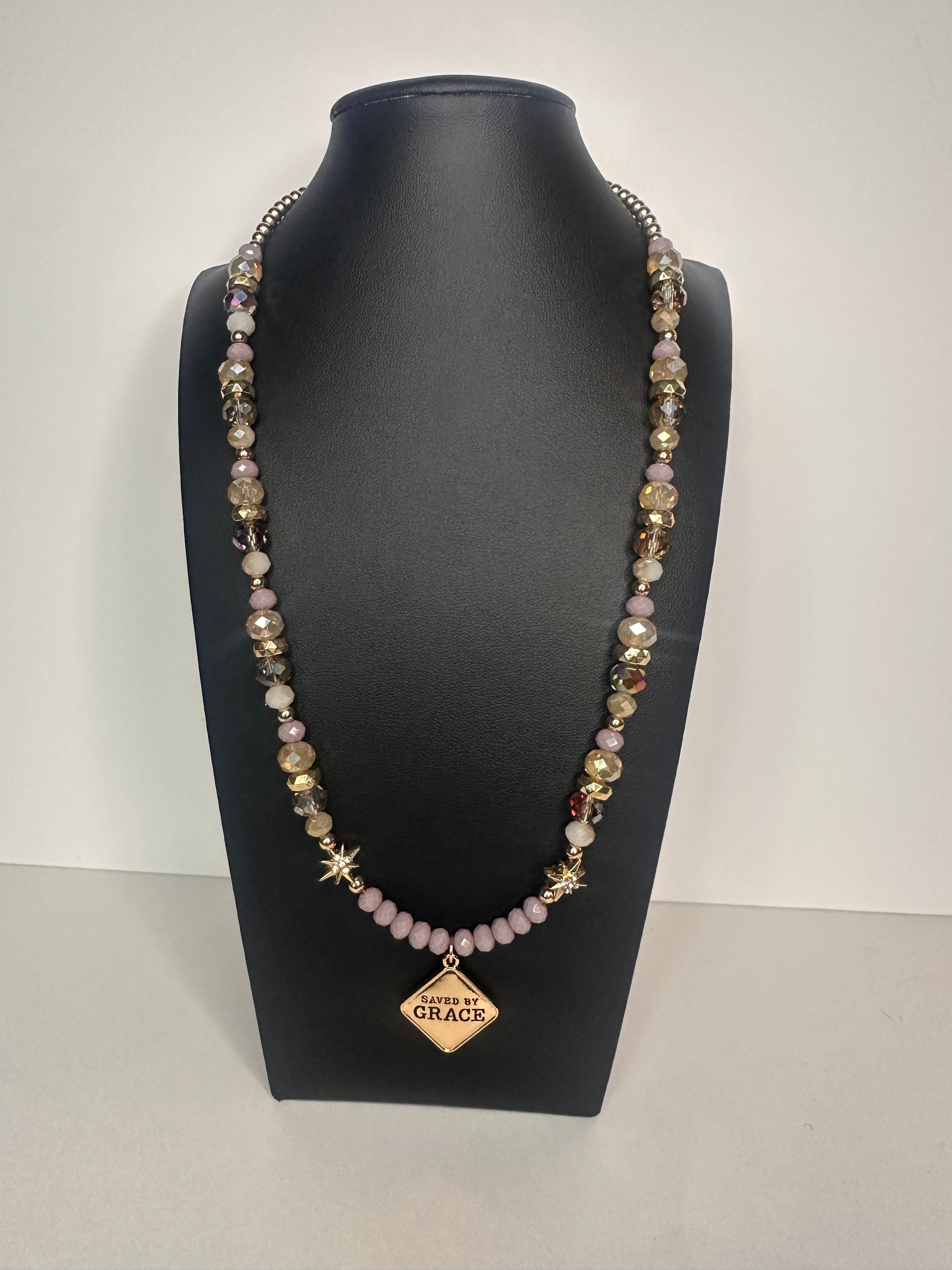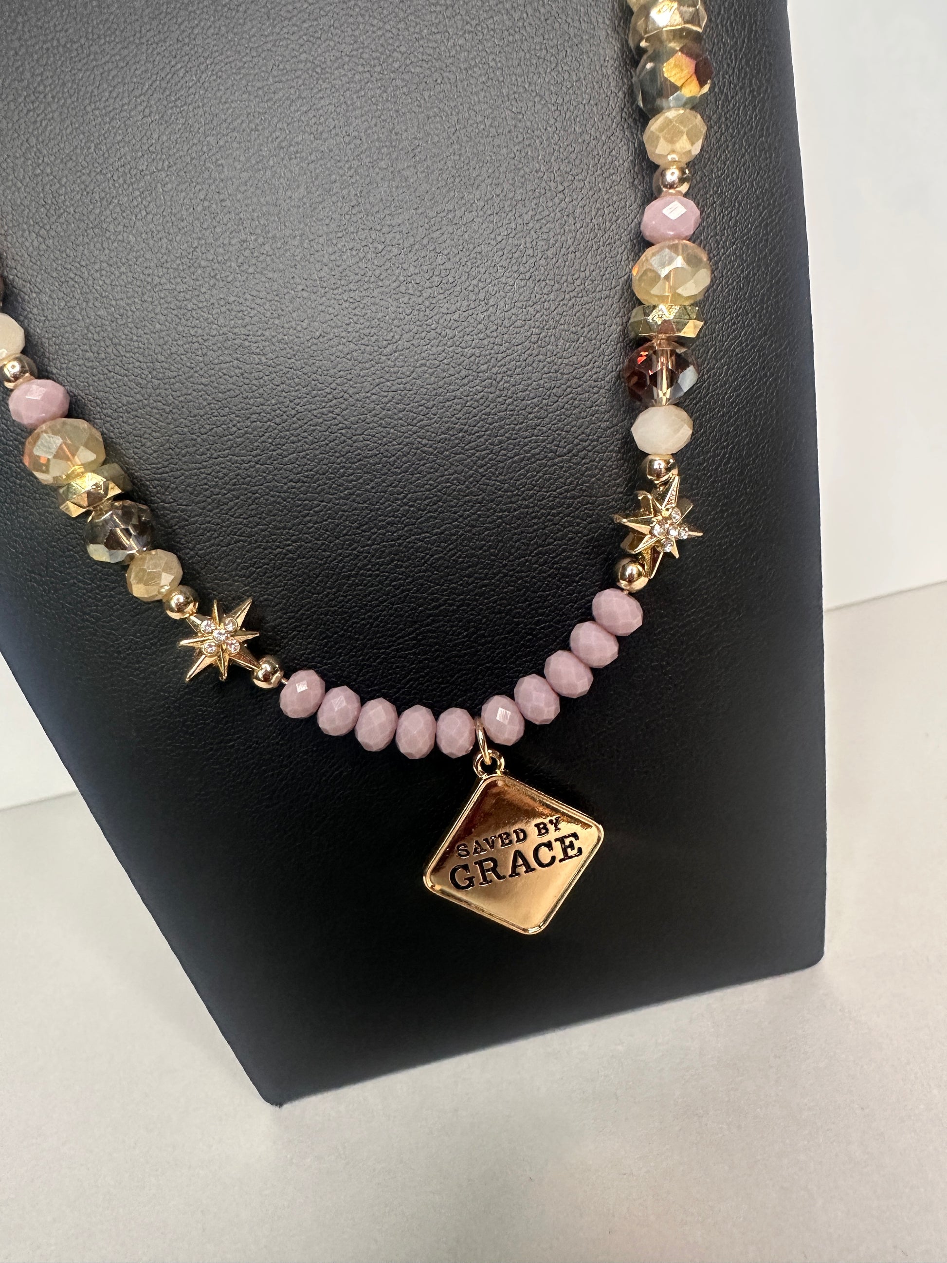 Crafted in shimmery lilac, neutrals, and sparkles, this necklace is a radiant reminder of Ephesians 2:8: “For it is by grace you have been saved through faith.” Wear it as a bold proclamation of the beauty and depth of His grace.