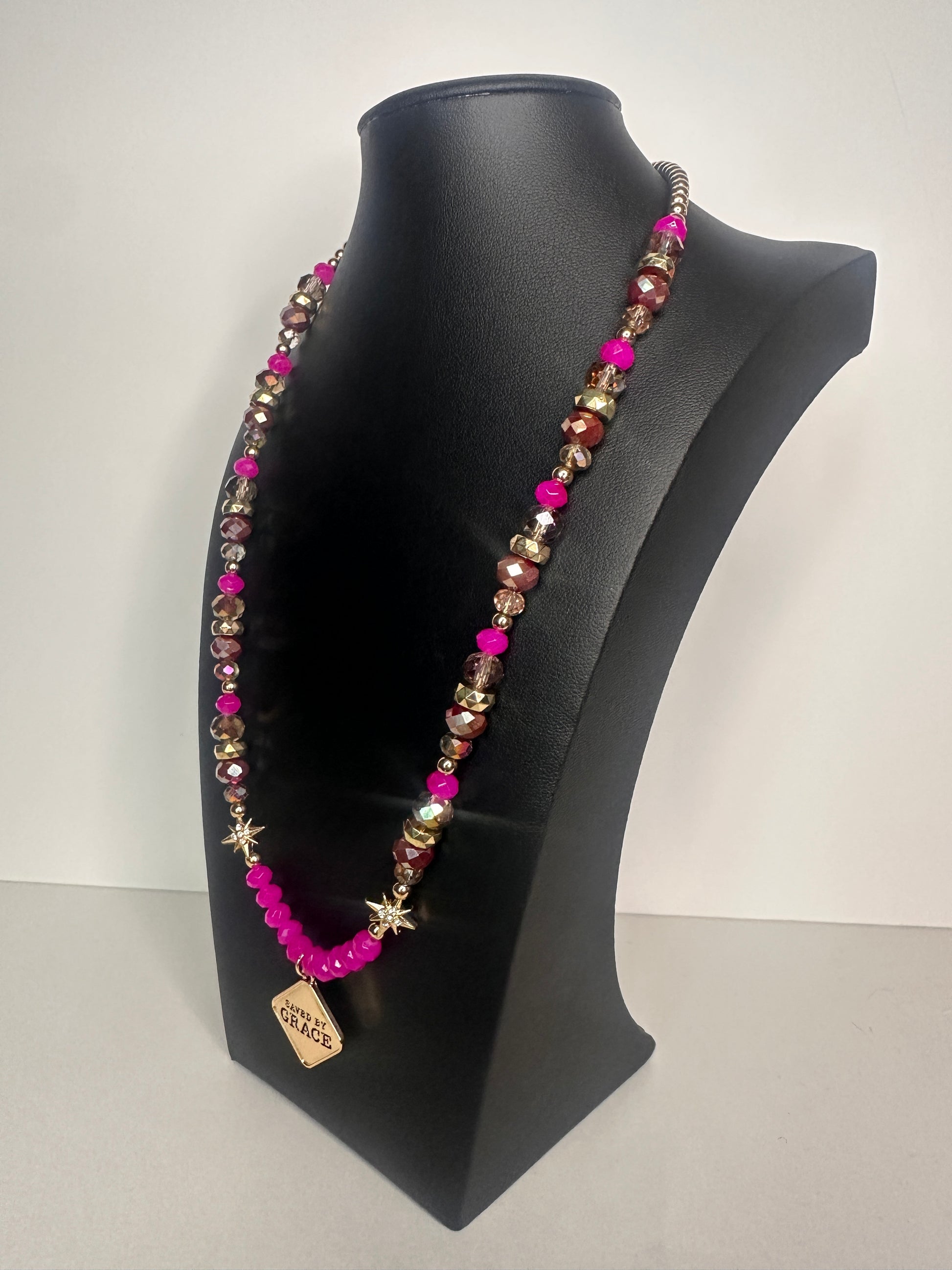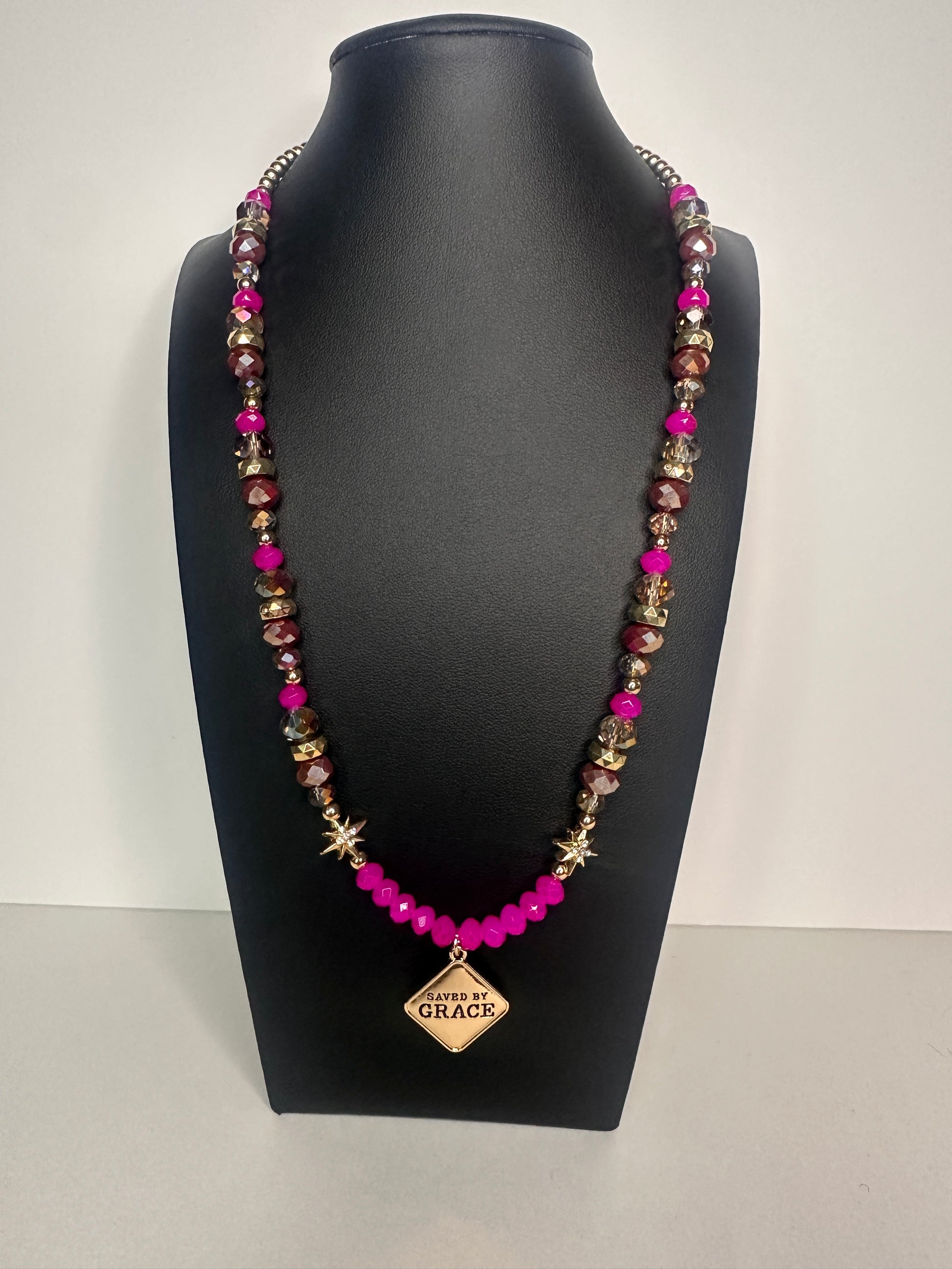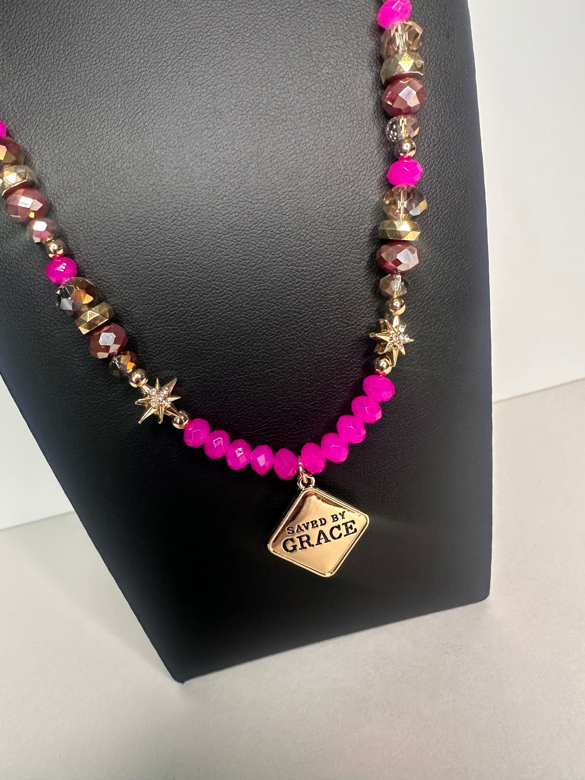 Crafted in shimmery magenta, pinks, neutrals, and sparkles, this necklace is a radiant reminder of Ephesians 2:8: “For it is by grace you have been saved through faith.” Wear it as a bold proclamation of the beauty and depth of His grace.